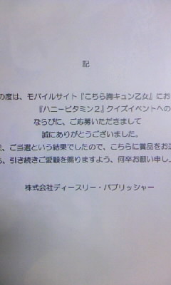 前にちらっと書いたんですが、胸キュンのハニビタ2クイズでまさかの当選を果たしていた景品が届きました。